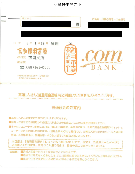 振込口座の通帳の表面と中開き面のコピー両方