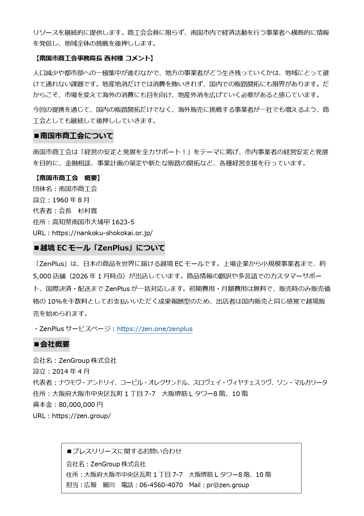 2026年 2月 4日 越境ECモールを運営する「ZenGroup(株)」との業務提携のお知らせ 当会は、越境ECモールを運営する「ZenGroup(株)」(所在地:大阪府大阪市)と業務提携を締結しました。 地域企業の販路拡大への取り組みとして、海外販売への支援体制を整備し発展と成長を図ります。